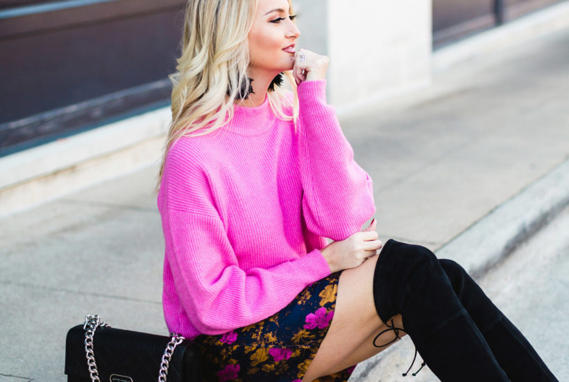 Follow my blog with Bloglovin Leith Sweater | Leith Floral Skirt | Stuart Weitzman Lowland Boot Henri Bendel Warren St. Handbag| Bauble Bar Parisian Feather Earring (25%OFF CODE: GIFT25) Shop the Post: